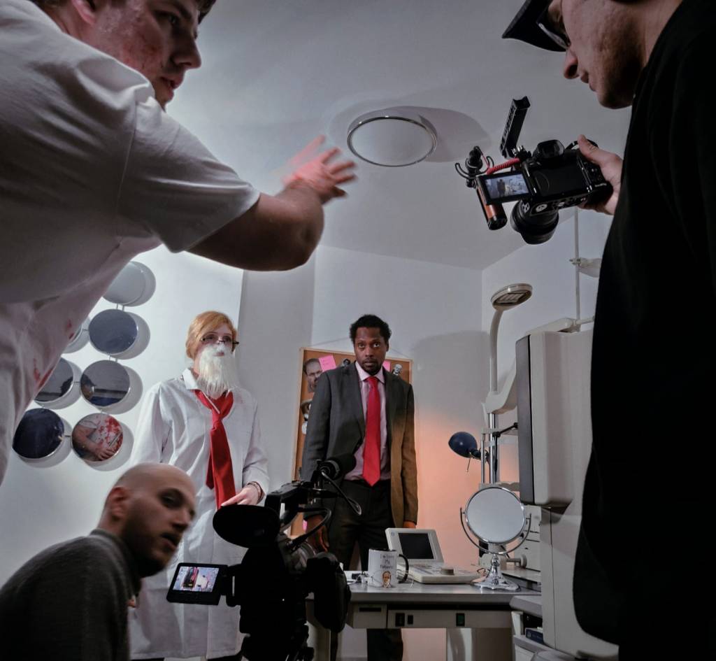 Early on I discovered that one big challenge in this process was working on such a low budget. In the script were many fantastical props we had to source such as eyeball shaped sweets, a stethoscope and glasses that looked like they belonged to Harold Shipman- not the easiest task and again proving the importance of A) Money and B) Time- if we had more of either of these in the pre production process it would have been a breeze but with deadlines looming we cracked on with casting, met the cast online for a read through and completed the final shot list/storyboard within a 2 week turnaround ready to shoot on Sunday 27th February to allow two weeks for post production.